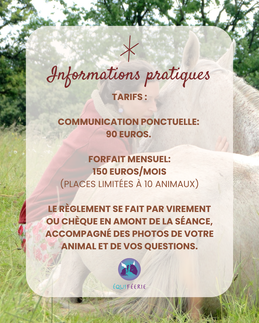 J'ai aussi créé ce forfait mensuel, comme un mentorat pour les personnes qui veulent prendre confiance dans leurs ressentis. Si vous ressentez et "entendez" parfois vos animaux, mais que le doute s'empare régulièrement de vous, entendre leurs messages et leurs réponses régulièrement peut vous amener à constater que vous aviez déjà reçu l'information. Vous rendre compte de votre capacité de manière répétée est une des meilleures manières pour progresser ou affiner vos perceptions.