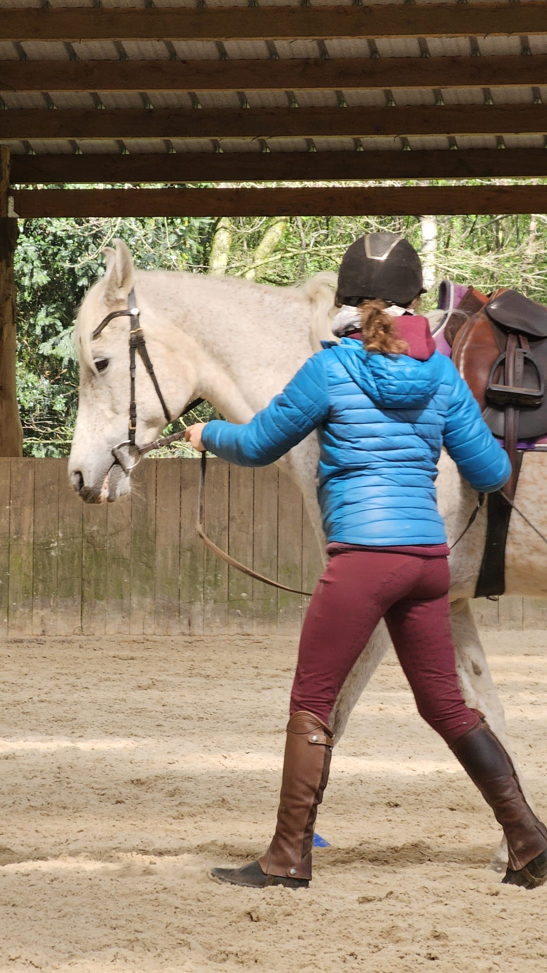Ce qui veut dire quelqu'un qui le prenne en longe et qui reste à côté de lui dans le manège où je travaille avec Abir et d'autres chevaux.