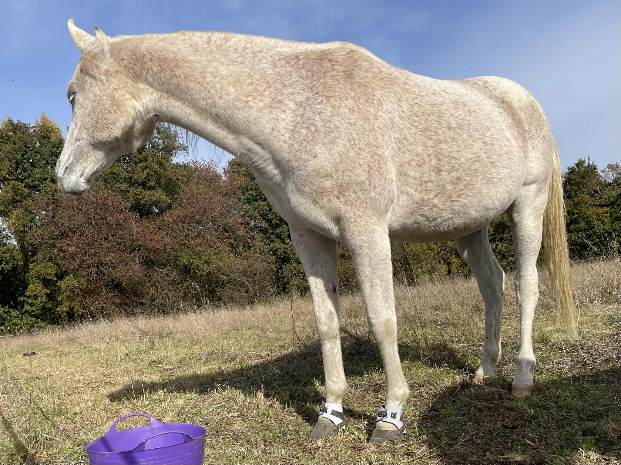 Abir a toujours eu les pieds sensibles sur les sols durs et caillouteux. Quand il a débarqué dans ma vie, il y a plus de 10 ans, il était ferré des antérieurs. Mais comme il est arrivé avec la maladie de lyme (taux d'infection maximal), sans parler de toutes les problématiques de comportement, je l'ai déferré puisqu'il restait au pré et n'avait pas de soucis sur l'herbe. Lors des sorties extérieures à pied, il allait naturellement chercher le moelleux du bas côté, et ça se passait bien comme ça.